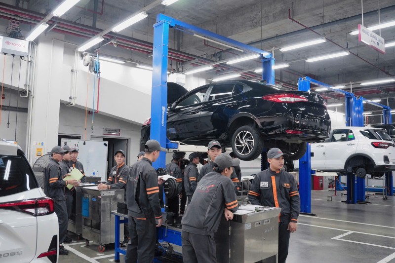 Sinh viên chăm chú lắng nghe kỹ sư giới thiệu quy trình vận hành và bảo dưỡng hệ thống động cơ ô tô.